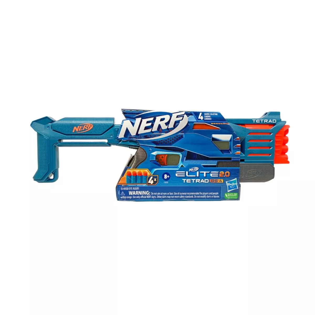 Hasbro Nerf Elite 2.0 Tetrad QS-4 Blaster Gun For Kids | 4 Elite Foam Soft Darts and 4-Barrel Blasting Tactical Rail for Customizing Capability Toy | 8+Years