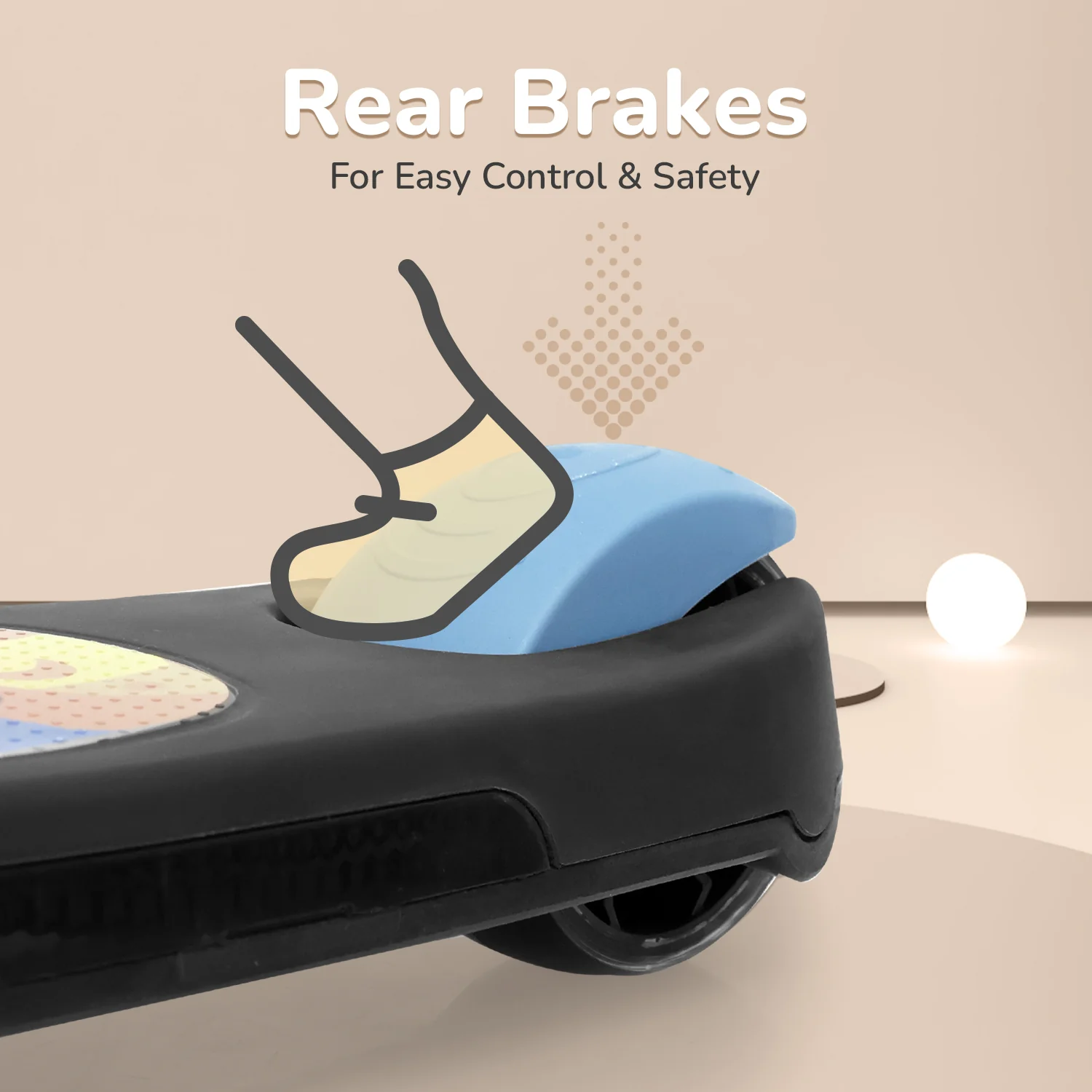 The Road Runner Astro Scooter is thoughtfully designed to keep kids entertained while ensuring their safety. The BIS-certified scooter comes with a rear brake system for added security, while the anti-slip wide deck offers a firm grip for stable rides. The rubber handle grip enhances comfort, making long rides a joy. Its PU LED wheels light up as kids ride, adding a touch of magic to their playtime. And with its smart-fold feature, carrying and storing this scooter is effortless. It’s the perfect balance of fun, safety, and convenience.