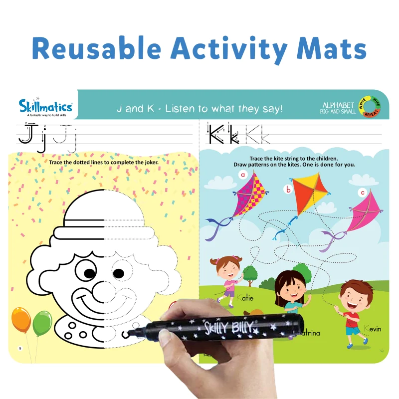 Skillmatics Alphabet Activity Mats are thoughtfully crafted to provide an immersive learning experience. Each mat features vibrant, clear letters in both big and small formats, allowing children to trace and write repeatedly using the included wipe-clean marker. The durable mats are easy to clean, ensuring hours of repeated practice without wear or tear. This educational set promotes hand-eye coordination, letter recognition, and writing confidence, making it ideal for independent learning or guided activities with parents and teachers. Lightweight and portable, the mats can be used at home, in classrooms, or on the go, keeping children engaged and motivated wherever they are.
