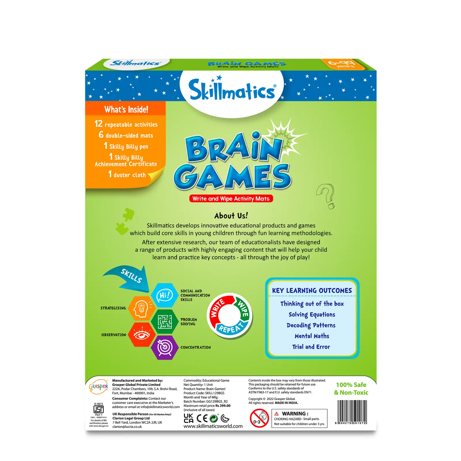 Contents: 12 Repeatable Activities , 6 Double- Sided Mats , 1 Skilly Billy Pen , 1 Skilly Billy Achievement Certificate , 1 Duster Cloth