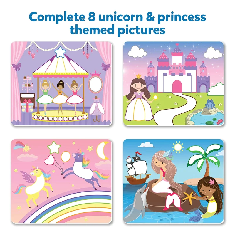 Skillmatics Dot IT! Unicorns And Princesses is more than just a sticker kit – it’s an immersive play experience that encourages children to create their own magical worlds. The set includes vibrant, pre-designed activity sheets featuring whimsical unicorns and charming princesses, along with hundreds of reusable dot stickers to decorate and design. As kids place stickers on the illustrations, they enhance fine motor skills, hand-eye coordination, and concentration, all while enjoying hours of screen-free fun.