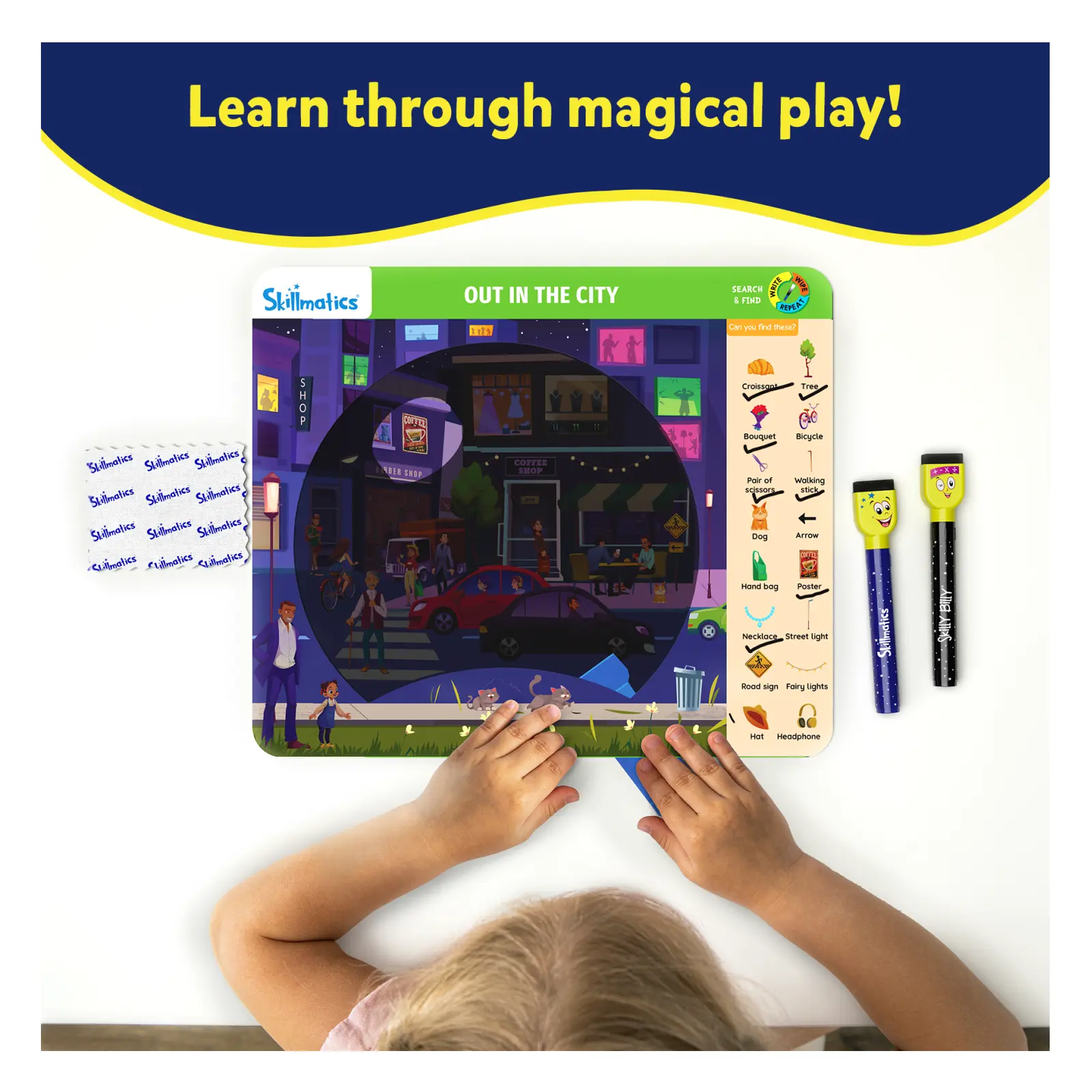 Turn everyday learning into a magical adventure with Skillmatics Search and Find Flashlight Magic. Designed to spark curiosity and imagination, this unique reusable activity set combines interactive play with skill-building fun. Children will love spotting hidden objects in vibrant daytime scenes and then flipping the mats to reveal enchanting night-time worlds that come alive with a paper flashlight.